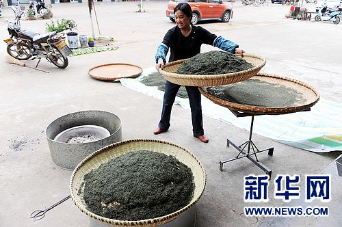 4月10日,信陽市浉河區(qū)董家河鎮(zhèn)的農(nóng)戶在晾曬烘烤茶葉。