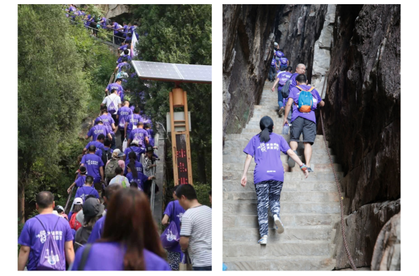 行至盧崖瀑布,泉水自山崖逐級(jí)跌落,聚水成潭,仿似人間仙境,令人流連忘返;稍事休整后,1000位登山者通過吊橋、一線天,沿途崖壁陡削,奇石林立。不少人已經(jīng)開始吃力,身強(qiáng)力壯的男士拉著女友的手一步一臺(tái)階地共同攀爬,稚嫩的孩童和爸爸媽媽一起,大手拉小手一邊說笑、暢享山水風(fēng)光,一邊努力克服陡峭險(xiǎn)阻的山路。到了峰頂,無論是浪漫的情侶還是幸福家庭,在群山之巔“一覽眾山小”,感悟真誠(chéng)和熱情、信任與支持,體會(huì)共擔(dān)風(fēng)雨的愛之真諦。