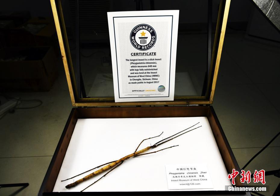 圖為中國巨竹節(jié)蟲(Phryganistria chinensis Zhao )最長個體,與獲得的吉尼斯世界紀錄證書。