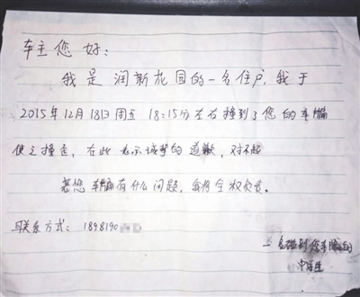 事情發(fā)生在12月18日。柏宇告訴成都商報記者,當天下午她外出買了冒菜回家,走到小區(qū)門口,一不留神撞到了旁邊一輛轎車的車頭,彎腰擦膝蓋時發(fā)現,轎車車牌面板被撞彎了。隨后,她跑回家寫了一張字條然后把字條貼到了轎車擋風玻璃上,“車主您好,我是潤新花園的一名住戶,我于2015年12月18日周五18點15分左右撞到了您的車牌,使之撞歪,在此表示誠摯的道歉,對不起,若您的車牌有什么問題,我將全權負責”,她還留下了手機號碼。