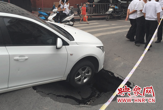 映象網(wǎng)訊(記者 駱瓊 王寬 文/圖)鄭州一條路又塌了,一個(gè)私家車被“坑”在了十字路口。8月17日中午12時(shí)15分,市民王女士開車行至經(jīng)二路緯四路交叉路口時(shí),突然地面下陷,車輛右前輪懸空,目前無法行駛。