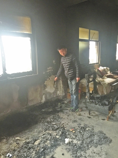 大河報(bào)記者看到,殯儀館現(xiàn)場(chǎng)有燒黑的一團(tuán)團(tuán)東西散落。進(jìn)入靈堂內(nèi),東側(cè)墻角地上許多燒黑的粉末和碎屑,一張被燒得不成樣子的椅子。距離椅子有一步之遙是一張木板床,床上凌亂地放著破舊的鋪蓋。死者家屬稱,守靈的三個(gè)人就在這張床上出了事。