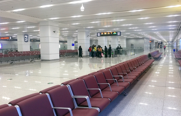 鄭機(jī)城鐵機(jī)場(chǎng)站候車大廳,空蕩的大廳內(nèi)只有少數(shù)乘客