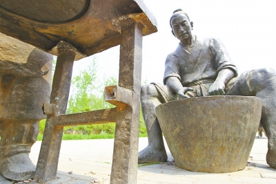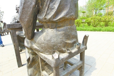 其中,第一組雕塑體現(xiàn)的是一個小男孩和一個小女孩在一塊石板上玩耍的場景,但十分刺目的是,小男孩右胳膊從腕關節(jié)上方處被鋸掉,右手不知去向,同時小女孩的兩個羊角辮也被鋸了一半;第二組是一個老年人和一個年輕人在切磋技藝的場景,但所用桌子的兩個桌牚均被鋸掉;第三組中,圍繞方桌飲酒賦詩的幾位老者所坐椅子靠背均被掰掉。