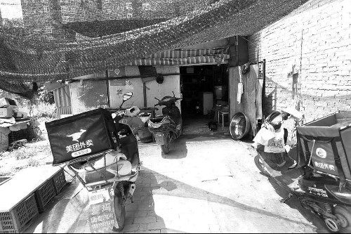 鄭先生所說的作坊,位于某高校東門對面不遠(yuǎn)處的一座廢墟旁。如果不是在中午時(shí)分,店內(nèi)不斷傳出鍋勺碰撞的聲音和門口停著的幾輛后置送餐箱的電動(dòng)車,很難注意到這個(gè)僅有10多平方米大小、由破舊的門板搭成的小屋是一家“飯店”。