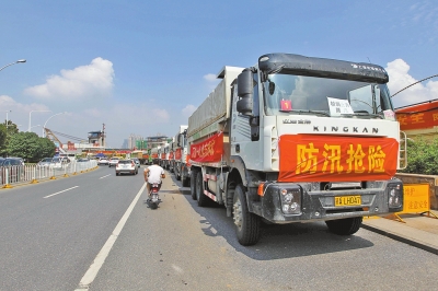 昨天,武漢市江漢區(qū)沿江大道,一排排渣土車滿載渣土,??吭诼愤叀iL(zhǎng)江北岸的堤壩上,到處張貼著“人在堤在”、“誓死保衛(wèi)大武漢”等宣傳標(biāo)語。