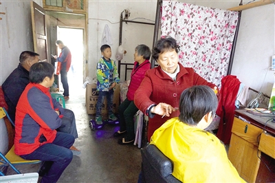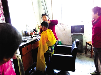 10月30日上午,在省紡機(jī)家屬院門(mén)口,老太太的理發(fā)店門(mén)外,黃色油漆寫(xiě)的“理發(fā)三元”的牌子格外醒目,在一間不大的理發(fā)店內(nèi),除去老太太的一張木板床外就是理發(fā)的東西,屋內(nèi)緊挨門(mén)口的長(zhǎng)凳上坐滿了前來(lái)理發(fā)的人們,有大人也有小孩,大家坐在那里一邊等著理發(fā),一邊互相閑聊著。老太太正在給一個(gè)十來(lái)歲的小男孩理發(fā),旁邊坐著小男孩的爺爺奶奶。一些附近的農(nóng)民工也不斷進(jìn)來(lái)詢問(wèn)老太太啥時(shí)候有空給他們理發(fā)。