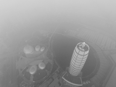 昨日(12月18日)中午,記者利用無人機爬升到最高升限500米仍舊沒能突破霧霾層,鏡頭中的“大玉米”籠罩在一片混沌當中。