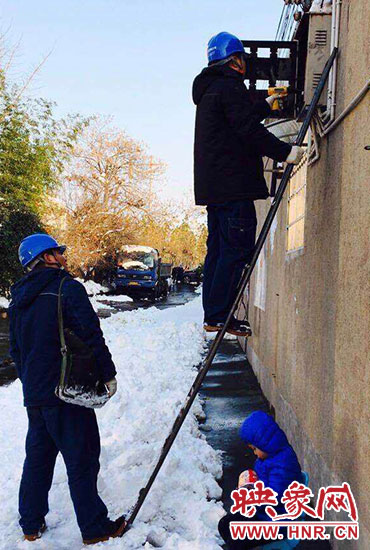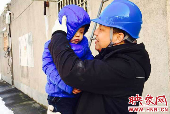 “你兒子睡著了,快下來吧?!?1月23日,正在架電線的新密供電公司岳村供電所員工李磊聽到同事叫他。李磊的兒子叫李昕龍,今年5歲,由于李磊妻子不在家,幼兒園又因雪放假,沒人照看李昕龍,李磊只好帶著他去上班。正在安裝智能表的李磊,聽到同事叫他,趕緊朝下一看,兒子在冰天雪地里已經睡著了。他急忙從梯子上下來,把孩子抱起來,由于剛睡著,孩子竟然沒有醒來,他只好繼續(xù)抱著孩子睡覺。