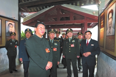 10月31日上午,習(xí)近平帶領(lǐng)全體中央軍委委員一起參觀會(huì)址。習(xí)近平來到當(dāng)年毛澤東作政治報(bào)告的廳堂,凝望著廊柱上富有鮮明戰(zhàn)斗性的標(biāo)語,注視著當(dāng)年會(huì)議代表取暖留下的斑斑炭火印跡,同大家一起回憶先輩們探尋革命道路時(shí)篳路藍(lán)縷、艱辛奮斗的情景,并向大家介紹他每次來古田參觀的情形和感受。