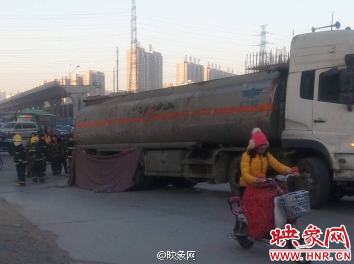 今天(1月19日)早上7點(diǎn)20分左右,鄭州市中州大道航海路上,一輛油罐車(chē)將一騎電瓶車(chē)男子碾倒在車(chē)下,事故現(xiàn)場(chǎng)被布遮擋,估計(jì)很慘。目前罐車(chē)司機(jī)已被控制住,事故還在處理中。