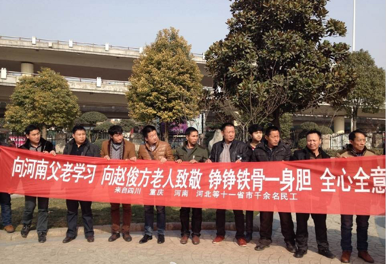 去年11月,濮陽(yáng)老人趙俊方(2010年“感動(dòng)中國(guó)”候選人)遠(yuǎn)赴山東聊城陽(yáng)谷,幫13省1000余農(nóng)民工討薪,經(jīng)過(guò)近兩個(gè)月努力,要回280萬(wàn)。為表感謝,1月17日,來(lái)自6個(gè)省份的農(nóng)民工兄弟齊聚鄭州,為老人送來(lái)錦旗。