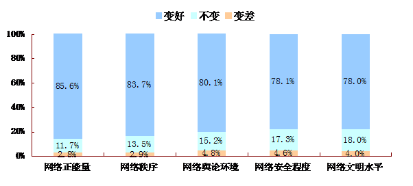 相應地,表示網(wǎng)絡環(huán)境不變或變差的網(wǎng)民比例很低。其中,表示網(wǎng)絡環(huán)境不變的網(wǎng)民比例普遍在10%-20%之間,表示網(wǎng)絡環(huán)境變差的網(wǎng)民比例則均低于5%。