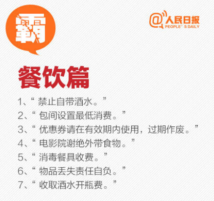 消協(xié)指出,影院禁帶食品屬霸王條款?!安蛷d禁止自帶酒水”“包間最低消費xx元”“一經(jīng)售出,概不退換”“本方擁有最終解釋權(quán)”“物品丟失本店概不負責(zé)”……熟悉吧?都是霸王條款!如果遇到,果斷打12315投訴,再不忍氣吞聲!為自己擴散