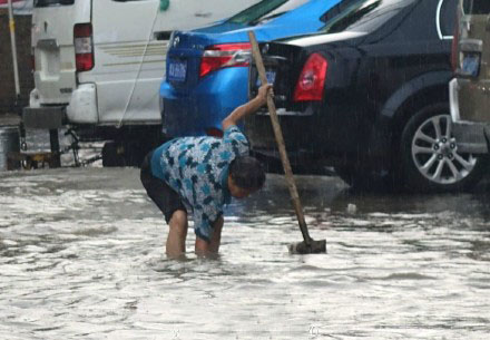 昨天下午,鄭州突降大雨??图悸分卸?,有200多米道路被雨水淹沒(méi),積水最深處已經(jīng)到腿肚。一位大媽冒著暴雨在積水中清理下水口附近的垃圾,試圖讓水流得更快一些。