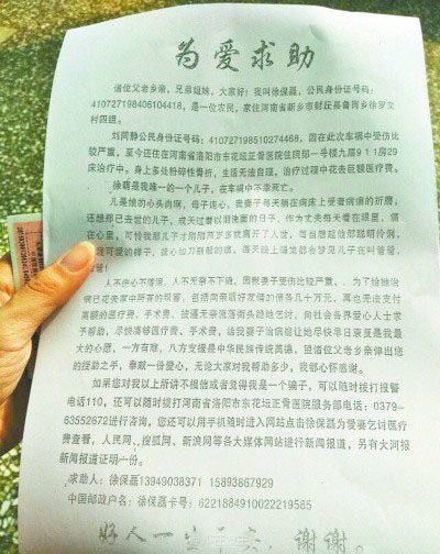 近日,有網(wǎng)友發(fā)微博稱,鄭州火車站候車廳,有個(gè)自稱徐保磊的人向旅客挨個(gè)散發(fā)傳單,稱妻子因出車禍住院無(wú)錢治療,向旅客乞討求助。經(jīng)多方調(diào)查:當(dāng)事人已出院兩年多,發(fā)傳單的不是徐保磊本人。大家不要上當(dāng)??!
