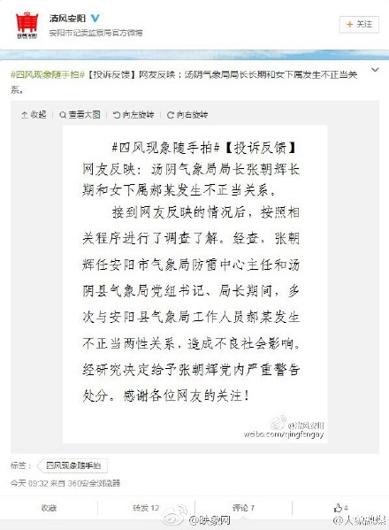 以往不少"性丑聞"官員都被查出貪腐問(wèn)題。不妨順藤摸瓜,查一查張朝輝是否存在其他問(wèn)題,給民眾一個(gè)交代。同時(shí),張朝輝今年初剛被任命為湯陰縣氣象局長(zhǎng),尚在1年試用期內(nèi)。既然出了如此影響惡劣的丑聞,組織上有必要對(duì)其任職資格和條件,重新進(jìn)行評(píng)估。