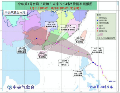 來自國家海洋局的消息,今年第4號熱帶風(fēng)暴“妮妲”于7月30日17時(shí)在菲律賓以東西北太平洋洋面上生成。為應(yīng)對此次臺(tái)風(fēng),國家海洋局7月31日啟動(dòng)海洋災(zāi)害一級應(yīng)急響應(yīng)。預(yù)計(jì)7月31日晚到8月1日下午,福建廈門到廣東深圳將出現(xiàn)30厘米到80厘米的風(fēng)暴增水,國家海洋預(yù)報(bào)臺(tái)已發(fā)布風(fēng)暴潮藍(lán)色警報(bào)、海浪橙色警報(bào)。