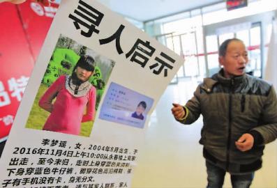 李先生說,女兒叫李夢瑤,出走時上身穿藍色夾克衫,下身穿藍色牛仔褲,腳上穿的是雙花色高沿棉鞋。