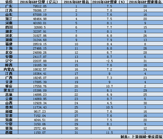 隨著2月19日海南省兩會開幕,地方兩會時間進(jìn)入尾聲,2016年各地GDP數(shù)據(jù)也已全部出爐。上游新聞-重慶晨報(bào)記者根據(jù)各地政府工作報(bào)告和統(tǒng)計(jì)部門數(shù)據(jù)發(fā)現(xiàn),GDP總量達(dá)到3萬億元以上的省份增至9個。