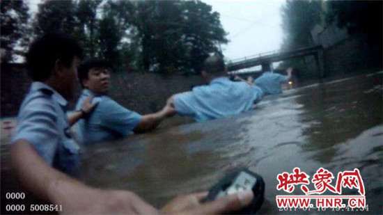 7月16日19時,新密市突降暴雨。19時30分許,正在附近執(zhí)行任務的新密市公安局西大街派出所民警呂鵬輝和輔警張靖、韓耀鵬、張文龍、張永康等接110指令:于家崗鐵路橋處有人被困在水中,請馬上前去解救。