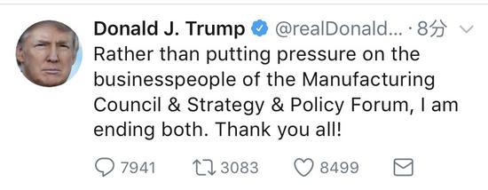 特朗普在推文中寫(xiě)道:“與其給制造業(yè)顧問(wèn)委員會(huì)和戰(zhàn)略與政策論壇的商人們施加壓力,我倒不如將它們都關(guān)閉,謝謝你們所有人!”