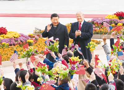 11月9日,國家主席習(xí)近平在北京人民大會(huì)堂東門外廣場舉行歡迎儀式,歡迎美利堅(jiān)合眾國總統(tǒng)唐納德·特朗普對中國進(jìn)行國事訪問。