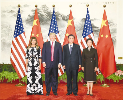 11月9日,國家主席習(xí)近平在北京人民大會(huì)堂東門外廣場舉行歡迎儀式,歡迎美利堅(jiān)合眾國總統(tǒng)唐納德·特朗普對中國進(jìn)行國事訪問。這是習(xí)近平和夫人彭麗媛在人民大會(huì)堂同特朗普夫婦合影。