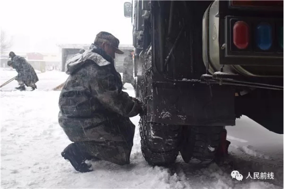 ▲第71集團軍某合成旅迅速啟動應(yīng)急方案,檢查并禁錮車輛防滑鏈。