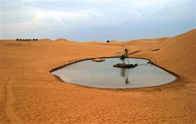 騰格里沙漠深處有一小湖泊,被開發(fā)成旅游景點。不過,由于地下水開采加劇,這個湖泊越來越萎縮。