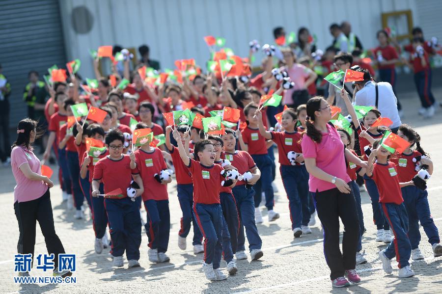 4月30日,孩子們?cè)诎拈T機(jī)場(chǎng)迎接大熊貓。當(dāng)日16時(shí)許,中央政府贈(zèng)送澳門的新一對(duì)大熊貓運(yùn)抵澳門,澳門特區(qū)政府行政法務(wù)司司長(zhǎng)陳海帆等官員及部分少年兒童在機(jī)場(chǎng)迎接。大熊貓經(jīng)檢疫人員檢查后在運(yùn)輸籠中向前來接機(jī)的人們短暫亮相。目前它們身體狀況良好,隨后將前往金像農(nóng)場(chǎng)進(jìn)行30天隔離檢疫。新華社記者張金加攝