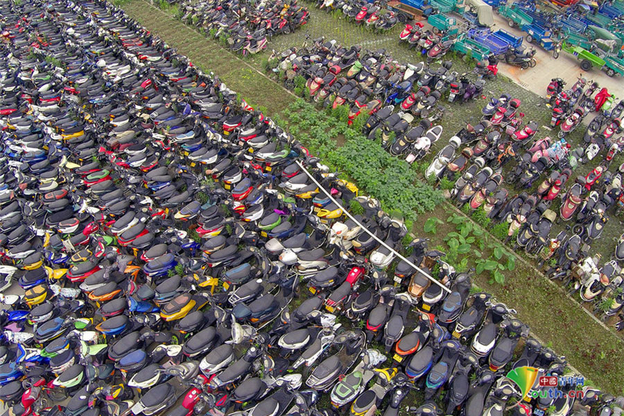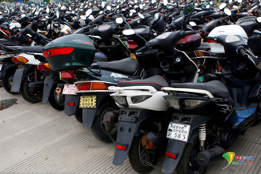 2015年6月4日,超寬、超速、非法營運(yùn)三輪電摩及各種摩托車密密麻麻重重疊疊地堆積在一起,從高空中俯瞰場面震撼。這不只是杭州一家報(bào)廢車停車場的情景,幾乎每家停車場都如此。工作人員說,這都是交警執(zhí)法過程中收繳的。工作人員跟記者抱怨說,電摩停放時間太長,再不拆解都停不下了!據(jù)負(fù)責(zé)人介紹,杭州自禁摩托車以來,總有一些違規(guī)者偷偷地利用摩托車充當(dāng)黑摩的。此舉既不安全,也暗藏各種不安全因素。2014年,杭州有204人死于涉及電瓶車的交通事故;在所有交通事故中,涉及電瓶車的占到四成以上。3月25日,有杭州媒體報(bào)道,杭州收繳的電動車已堆滿停車場,據(jù)估算馬路上還有百萬輛以上超標(biāo)車。(金童子/攝)