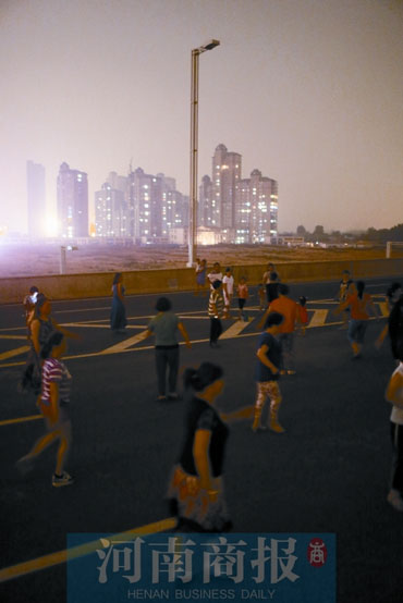 前天晚上7時(shí)30分,鄭州市南三環(huán)與京廣路交叉口向南500米路西,幾名市民沿著高架橋匝道向二層走去。高架橋二層橋面西側(cè),人們?nèi)宄扇?,大人們邊走邊聊天,小孩兒則在車道上嬉笑玩耍。東側(cè),一名女士大步快速地向北走,“不刮風(fēng)不下雨,沒(méi)事兒就來(lái)這鍛煉?!贝送猓€有30多名市民正在跳廣場(chǎng)舞。