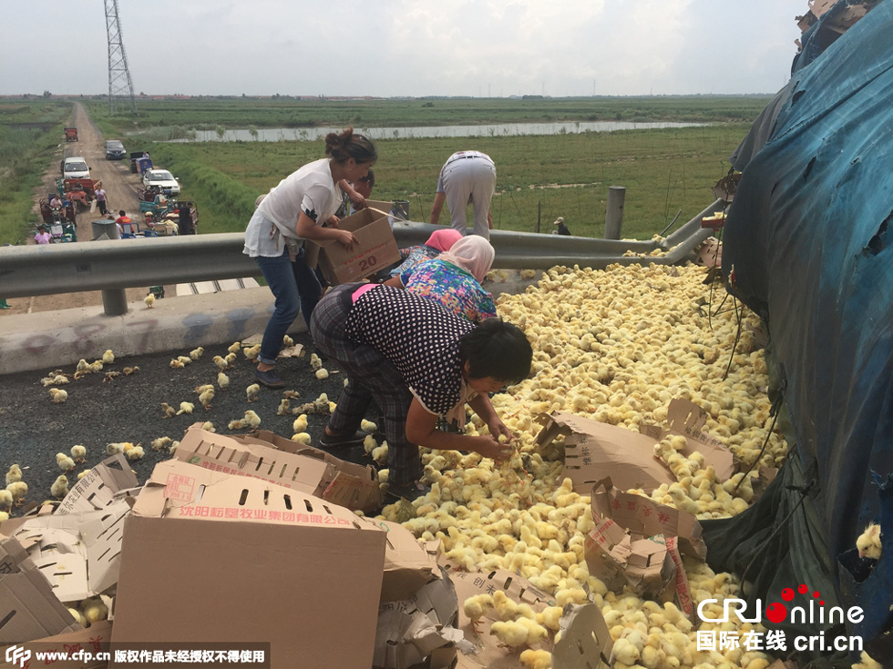 山東榮烏高速濱州沾化區(qū)段,一輛山東禽類運(yùn)輸車傾翻,數(shù)萬(wàn)只小黃雞散落在地,附近村民聞?dòng)?,紛紛前?lái)抓小雞。圖片來(lái)源:CFP