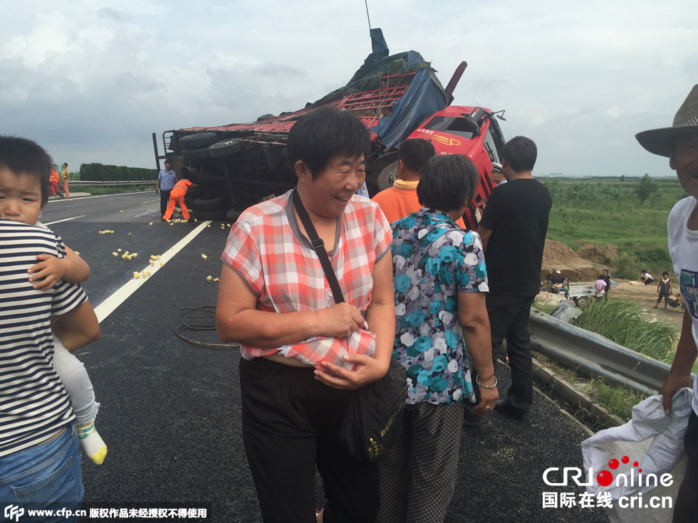 山東榮烏高速濱州沾化區(qū)段,一輛山東禽類運(yùn)輸車傾翻,數(shù)萬(wàn)只小黃雞散落在地,附近村民聞?dòng)崳娂娗皝?lái)抓小雞。圖片來(lái)源:CFP