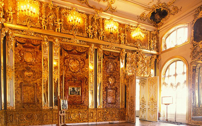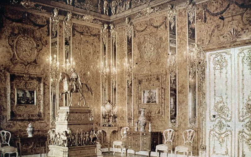 據(jù)悉,所謂的琥珀屋最初據(jù)說只是一個琥珀櫥柜,但最終被擴大為琥珀屋,共用掉450公斤琥珀,直到1770年才完工。納粹于1941年10月份攻陷位于圣彼得堡附近的凱瑟琳宮,并將琥珀屋拆除帶走,最終通過鐵路將琥珀屋運回當時東普魯士的科尼斯堡城堡(Koenigsberg Castle)安放??墒窃?945年1月份,這里遭到空襲和激烈的地面攻擊,琥珀屋從此下落不明。