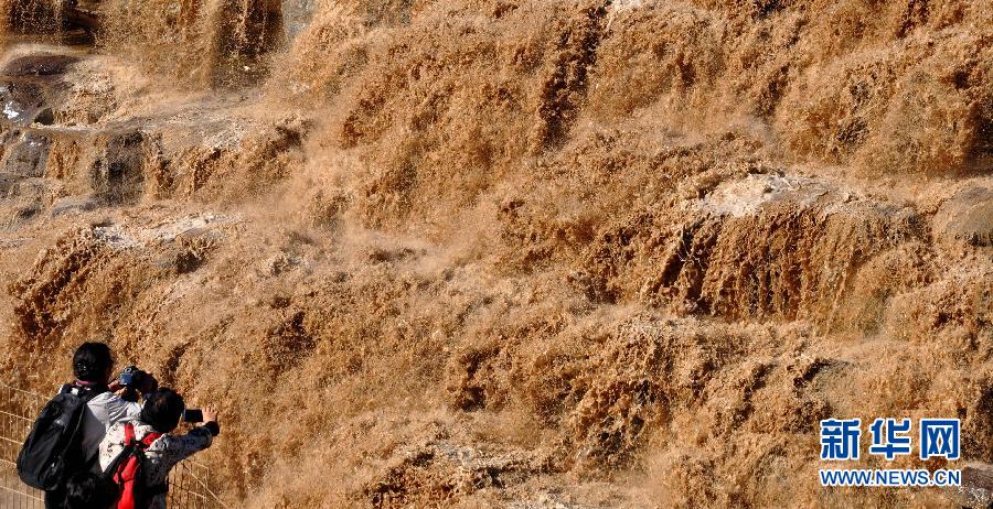 9月13日,游客在山西省吉縣黃河壺口瀑布景區(qū)觀賞瀑布。近日,受上游降雨和水庫(kù)調(diào)節(jié)放水影響,黃河干流迎來(lái)秋汛,位于山西吉縣和陜西宜川縣交界的壺口瀑布水量大增,形成壯美瀑布,吸引眾多游人前來(lái)觀瀑。新華社發(fā)(呂桂明 攝)