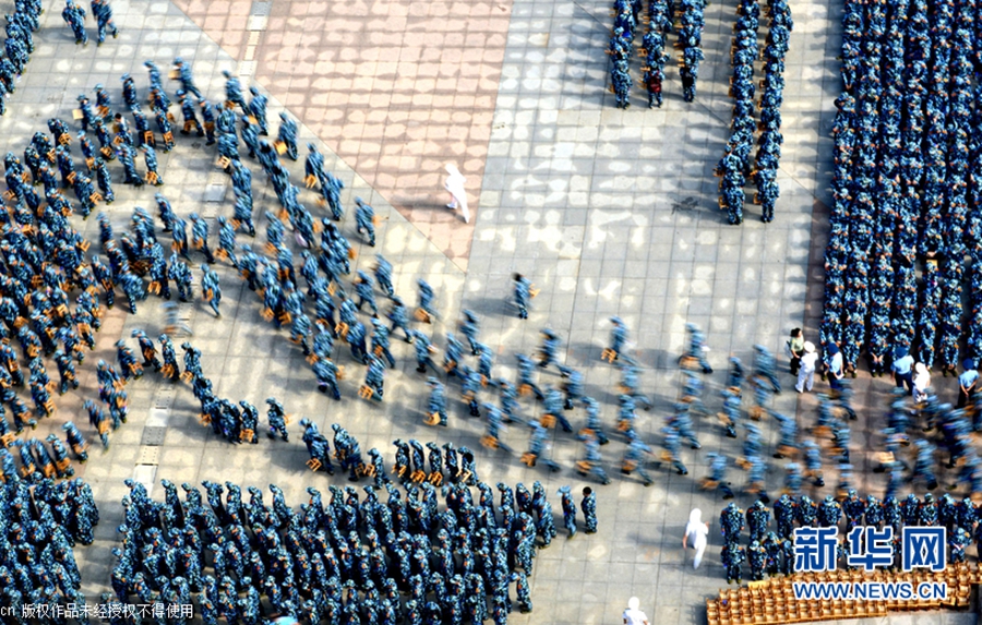 2015年9月14日,湖北武漢,當(dāng)日上午,武漢理工大學(xué)2015級(jí)本科生開學(xué)典禮暨軍訓(xùn)動(dòng)員大會(huì)在該校南湖校區(qū)舉行,全校多個(gè)校區(qū)約9000名新生身著迷彩戎裝一起進(jìn)行軍訓(xùn),場(chǎng)面震撼壯觀。南湖校區(qū)現(xiàn)場(chǎng)集合了約7000名新生參與軍訓(xùn),隊(duì)列整齊、英姿颯爽,熱情投入軍訓(xùn),開啟了朝氣蓬勃的大學(xué)新生活。圖片來源:cfp