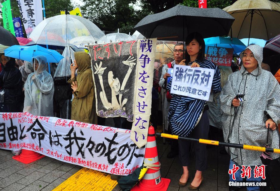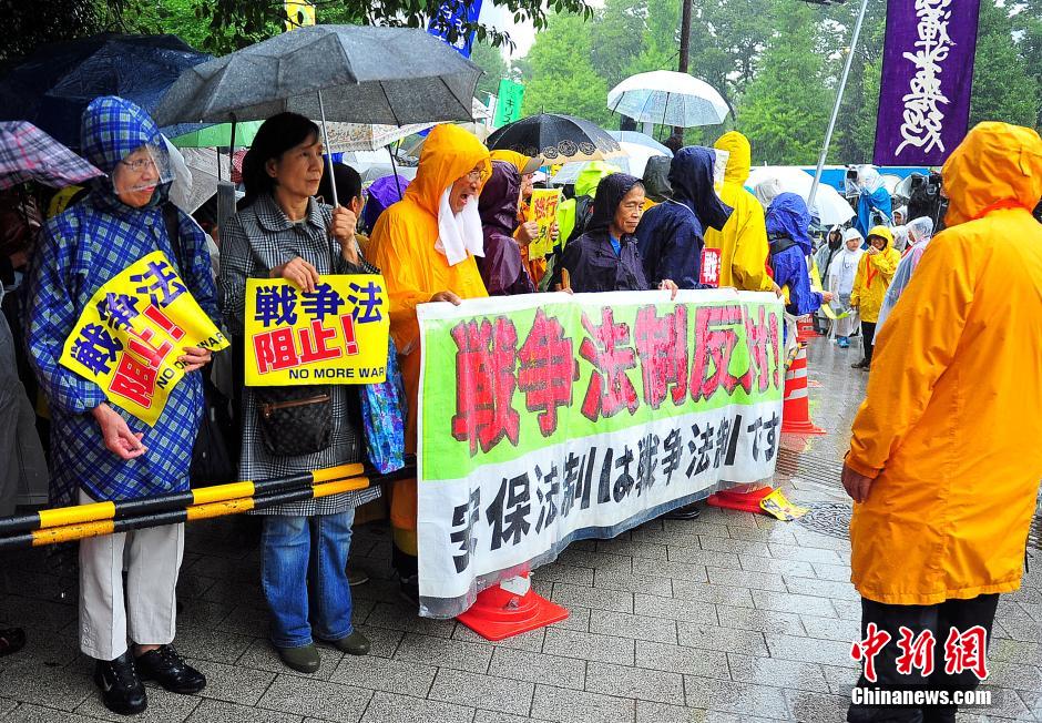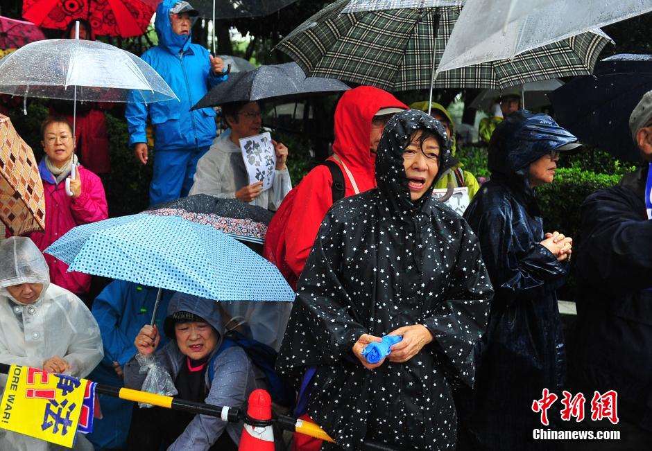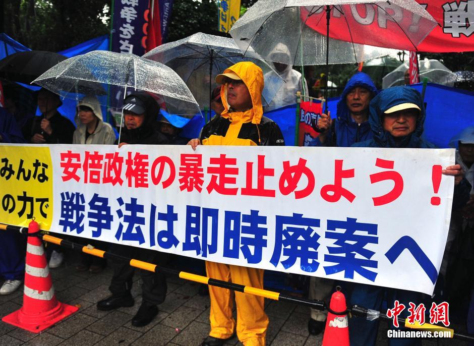 隨著安倍陣營強推以解禁集體自衛(wèi)權(quán)為核心內(nèi)容的安保法案最終過關(guān)的計劃進入“倒計時”,日本民眾的反安保抗議活動再度進入高潮。在之前徹夜抗議之后,9月17日白天,又有眾多日本民眾冒著大雨持續(xù)聚集在國會周邊進行抗議活動。中新社發(fā) 王健 攝