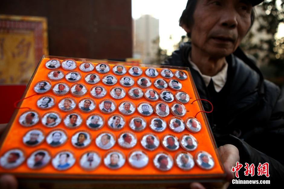12月26日,是毛澤東誕辰122周年紀(jì)念日,河南鄭州紫荊山紫荊山廣場,鄭州退休老軍人李廷林依照毛澤東的照片或畫像制成的120枚毛澤東紀(jì)念章亮相。中新社記者 王中舉 攝