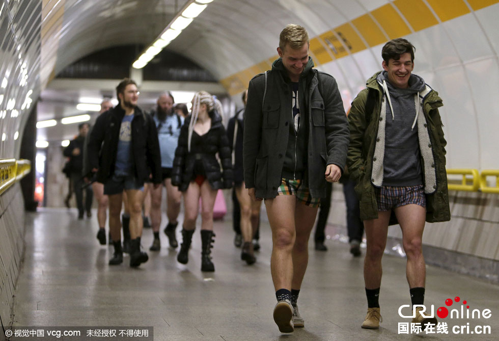 當?shù)貢r間2016年1月10日,捷克布拉格,“地鐵無褲日”當天,乘客穿短褲乘車。圖片來源:視覺中國