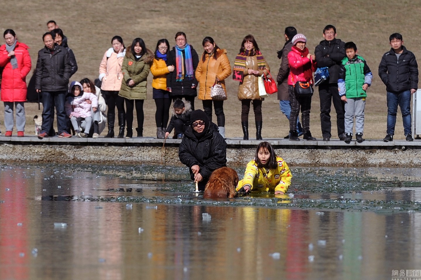 “狗狗主人一直告訴它要用力。”項先生說大金毛雖然奮力掙扎,卻無濟于事,越掙扎陷得越深,體力也消耗了不少。一旁的狗主人很是著急,決定下水救它,無奈女同志體力有限,基本破不了冰。不忍看著一個生命就這樣消失。圖為眾人圍觀被困冰窟的金毛。