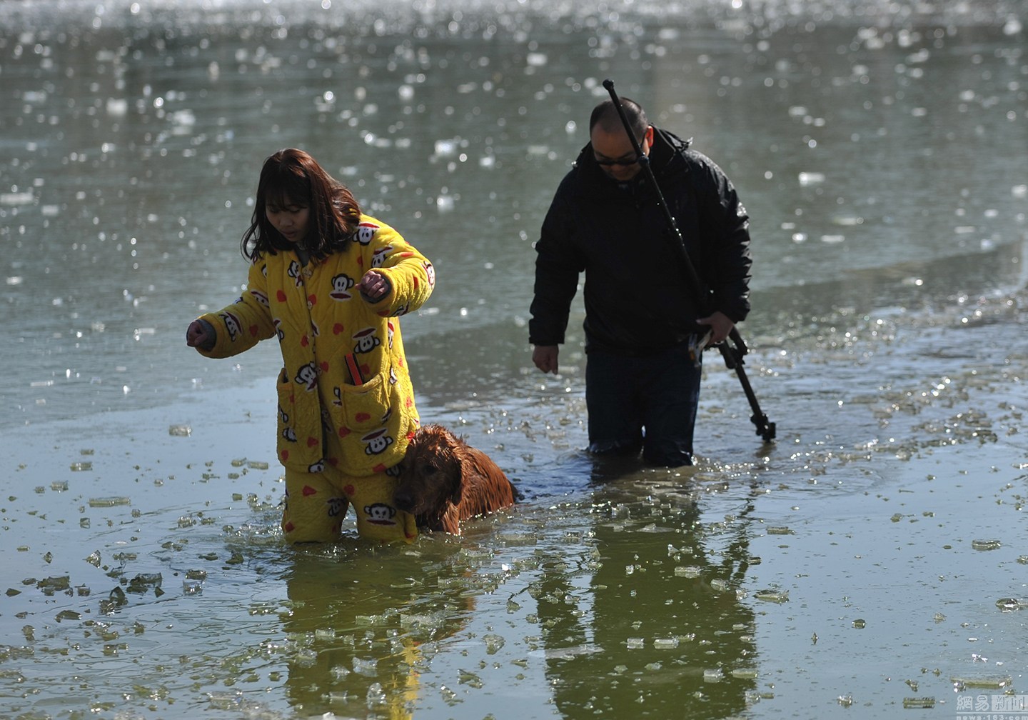 就這樣,水面由他的膝蓋深到其腰部。近十分鐘的時間,項先生為金毛打開了一條近30米長的冰道,落水的金毛獲救了。圖為主人和好心市民項先生一同走向金毛。