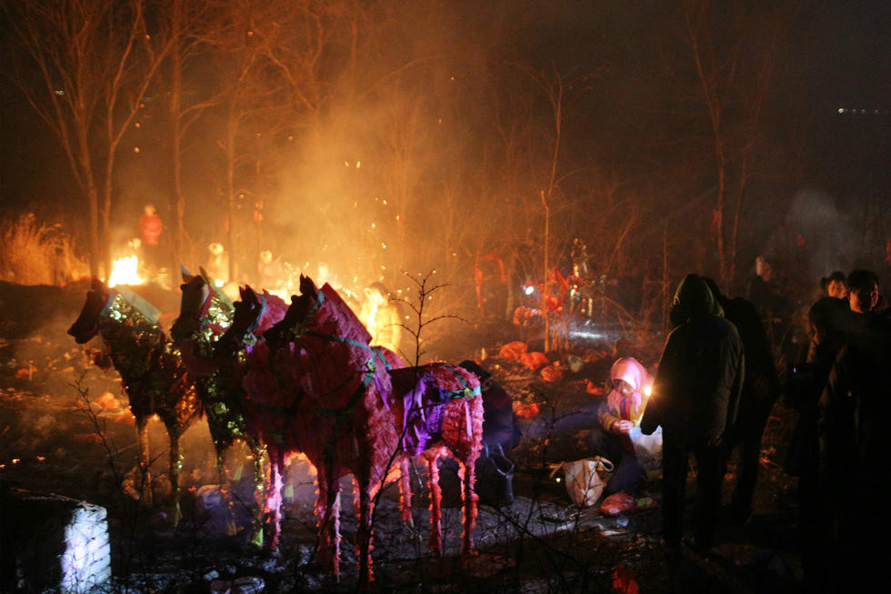 2016年2月23日凌晨,山東省濱州市惠民縣小霹靂莊,宋代古冢牛保冢上一年一度的正月十六祭祀活動(dòng)正式開始,方圓百里萬余百姓陸陸續(xù)續(xù)趕來祭祀,以求風(fēng)調(diào)雨順,家和事興。多種祭祀用紙馬先后被抬上祭壇引燃,化作火龍直沖云天,數(shù)量足有數(shù)千匹之多,場面壯觀且奇異,親臨現(xiàn)場宛若置身神鬼大片,令人印象深刻。