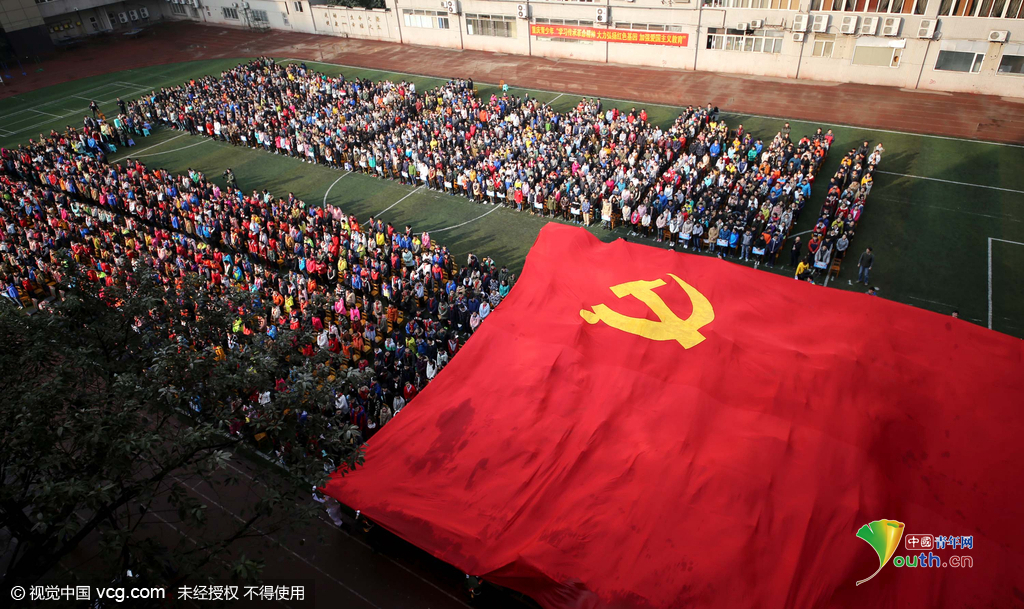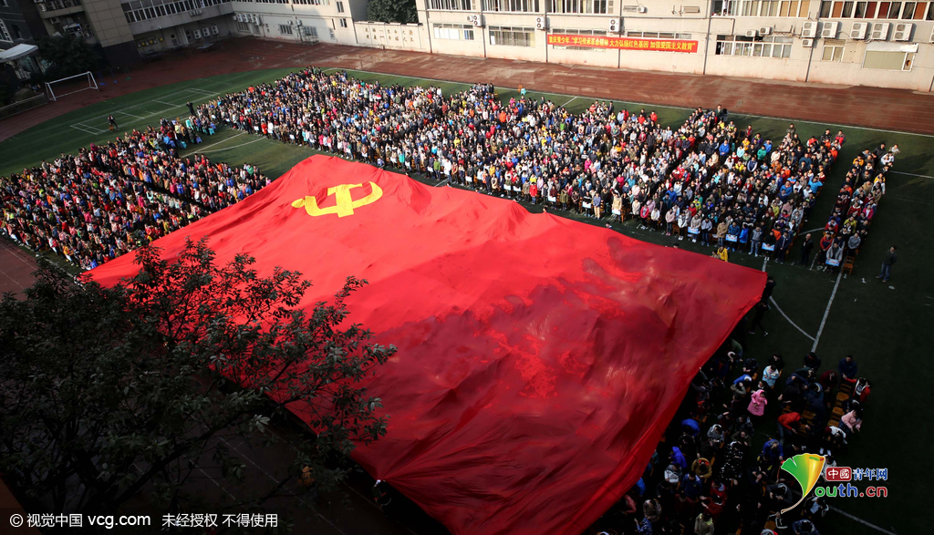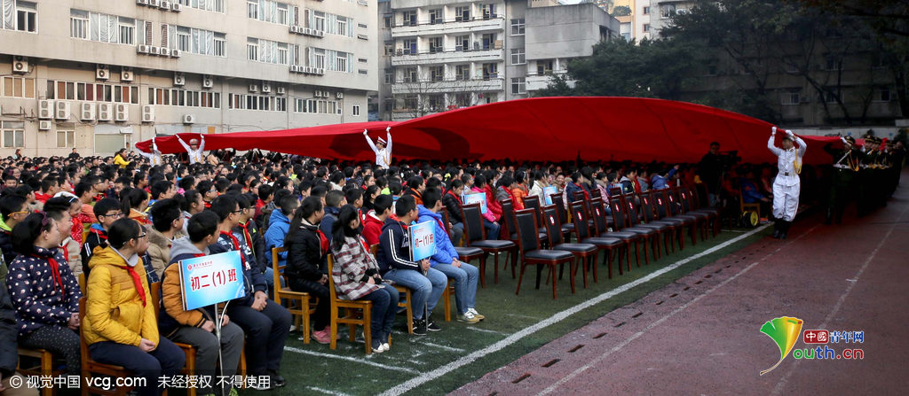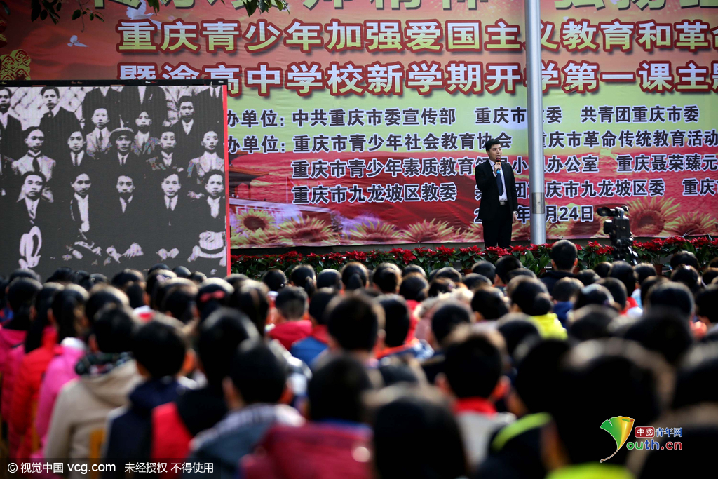 2016年02月24日,重慶市新區(qū),渝高中學(xué),開學(xué)典禮上同學(xué)們傳遞一面90米寬的巨大黨旗。開學(xué)第一課由聶榮臻元帥陳列館報(bào)告團(tuán)成員為同學(xué)們宣講老一輩無(wú)產(chǎn)階級(jí)革命家的豐功偉績(jī)。視覺(jué)中國(guó)