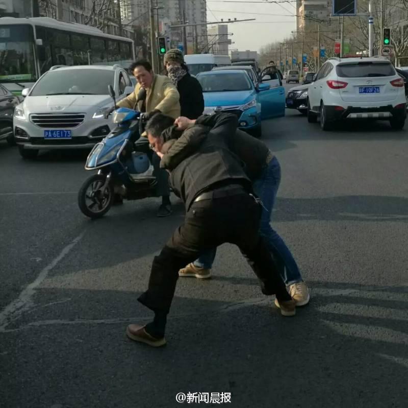 晨報(bào)訊 你一個(gè)過肩摔,我一個(gè)橫掃腿,接著扭打在一起,互相纏斗難分伯仲……這幕刺激的武打動(dòng)作場景,昨天早高峰時(shí)在上海安波路營口路上演,而沖突竟源于“路怒”!目擊者肖先生告訴記者,昨天上午8點(diǎn)不到,他經(jīng)過安波路、營口路路口時(shí),看看兩名男子扭打在一起,場面十分激烈?!拔翼槃?shì)拿出手機(jī)拍了幾張照片,旁邊也有行人上去勸架?!毙は壬f,在兩名男子的身旁,一橫一豎停著兩輛轎車,“我想可能是兩個(gè)人開車有點(diǎn)摩擦引起的‘路怒’吧。”