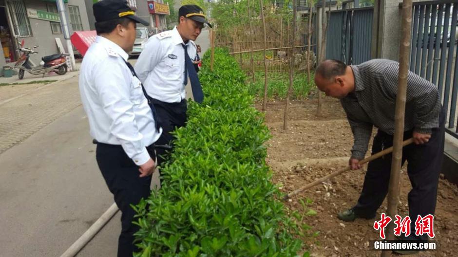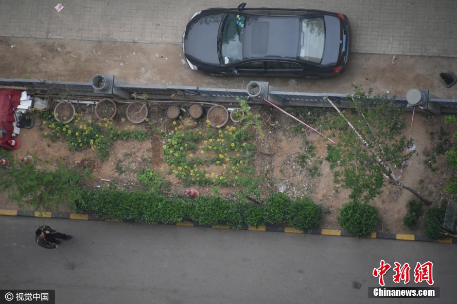 4月5日上午9時許,未來路街道巡防隊(duì)員司廣紅、盧龍等三人巡邏中發(fā)現(xiàn)一件奇葩事:有一根消防管從燕莊新區(qū)南院9號樓北面的20樓一家住戶窗口被放下,水管的另一頭直通小區(qū)柵欄里的小菜園。鄭州市燕莊村一村民住上了高樓,卻仍然放不下種地種菜。把小區(qū)垃圾清理出來,開墾出一片小菜園,又從20層的高樓往下放水澆菜。這種菜的成本遠(yuǎn)高于買菜,但他卻樂在其中。李四信 攝 圖片來源:視覺中國