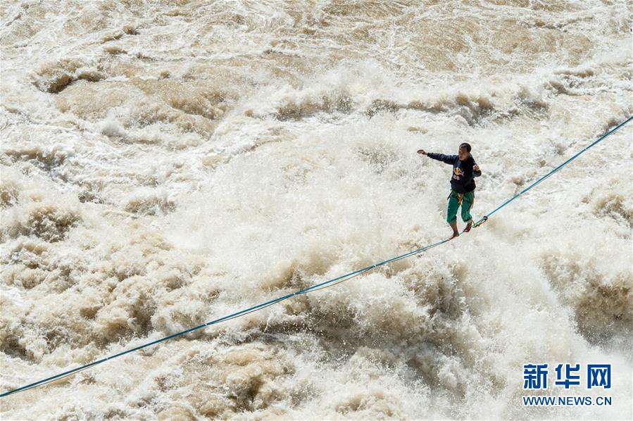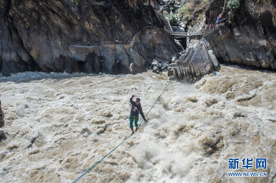 4月26日,張亮在扁帶上行走。當(dāng)日,在云南香格里拉的長江天險虎跳峽上,“中國扁帶第一人”張亮利用寬度只有2.5厘米的扁帶,在距離江面16米的高度上成功行走60米,耗時5分58秒抵達虎跳峽香格里拉一側(cè)的終點完成挑戰(zhàn)。