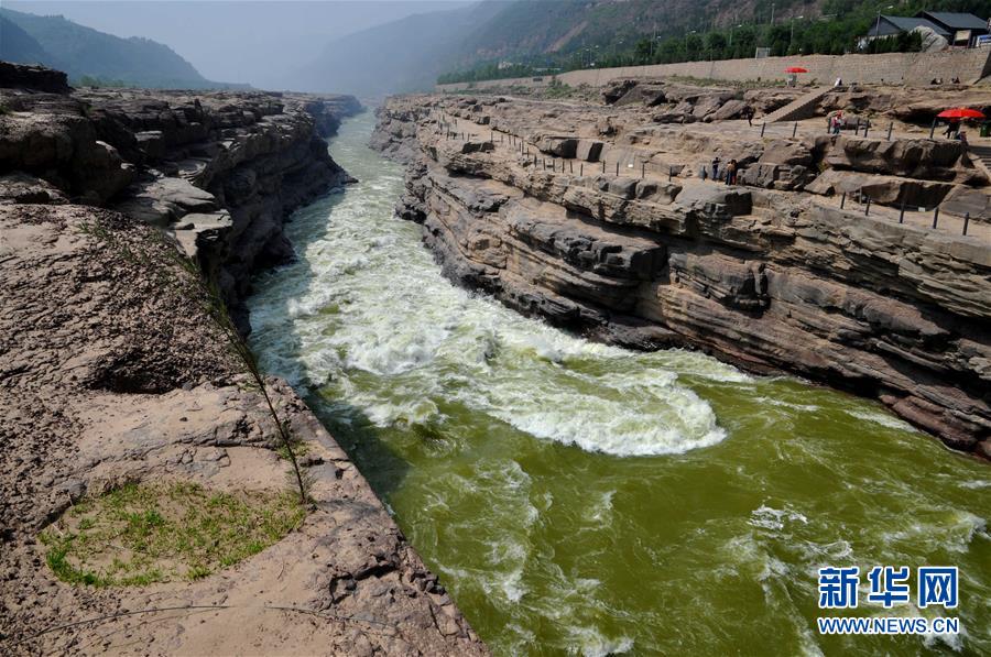 5月10日,黃河壺口瀑布十里龍槽水流明顯變清。自4月下旬以來,受上游降雨偏少和黃河干流來水量減少影響,河水流速變緩,泥沙沉淀,位于山西吉縣和陜西宜川縣交界的壺口瀑布水色明顯變清,呈現(xiàn)出別于日常的“清流飛瀑”景觀。新華社發(fā)(呂桂明 攝)