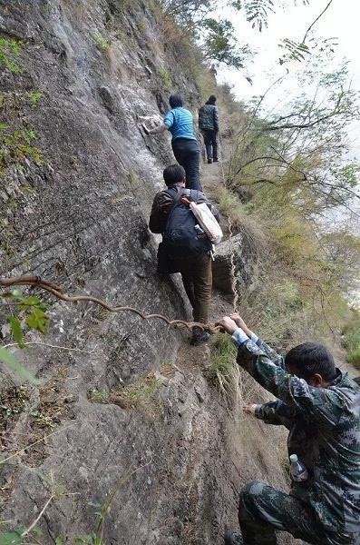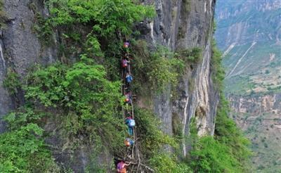 15個(gè)孩子中多數(shù)是女孩,在三個(gè)家長(zhǎng)的保護(hù)下,背著沉沉的書包,大約用了2個(gè)小時(shí),到達(dá)“懸崖村”。村里通向外界,需要順著懸崖斷續(xù)攀爬17條藤梯,其中接近村莊的幾乎垂直的兩條相連的藤梯長(zhǎng)度約100米,沒有藤梯的崖壁才是最危險(xiǎn)的。據(jù)支爾莫鄉(xiāng)黨委書記阿皮幾體講,他知道的在這條路上摔死的人有七八個(gè),有村里的人,也有外來(lái)的人,而摔傷的人更多。